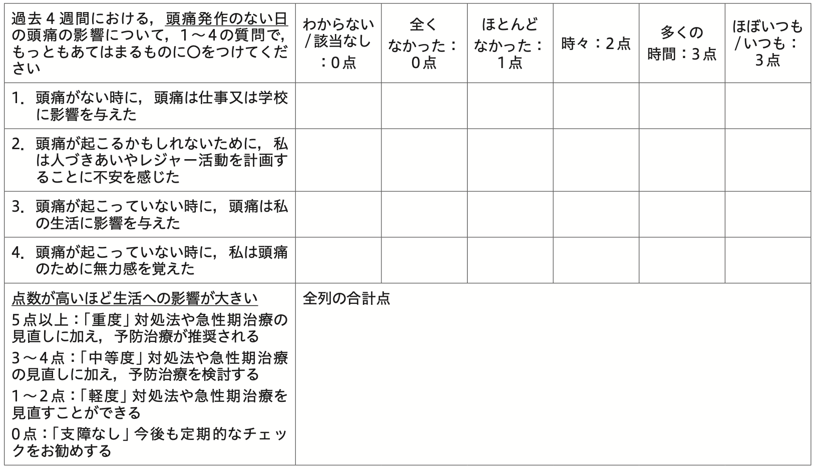 表1 日本語版Migraine Interictal Burden Scale-4(MIBS-4:片頭痛発作間欠期負担評価尺度)