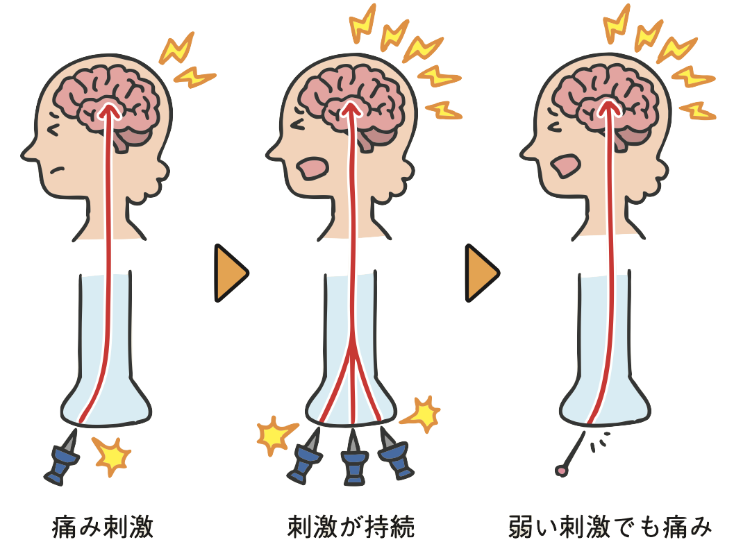 痛み刺激が長期にわたると,疼痛感作という現象が生じ,通常なら反応しないような弱い刺激でも痛みとして感じやすくなる。これは,末梢神経で起こる末梢性感作や,脊髄などの中枢神経で起こる中枢性感作として知られており,痛みの慢性化につながると考えられている(図2)。